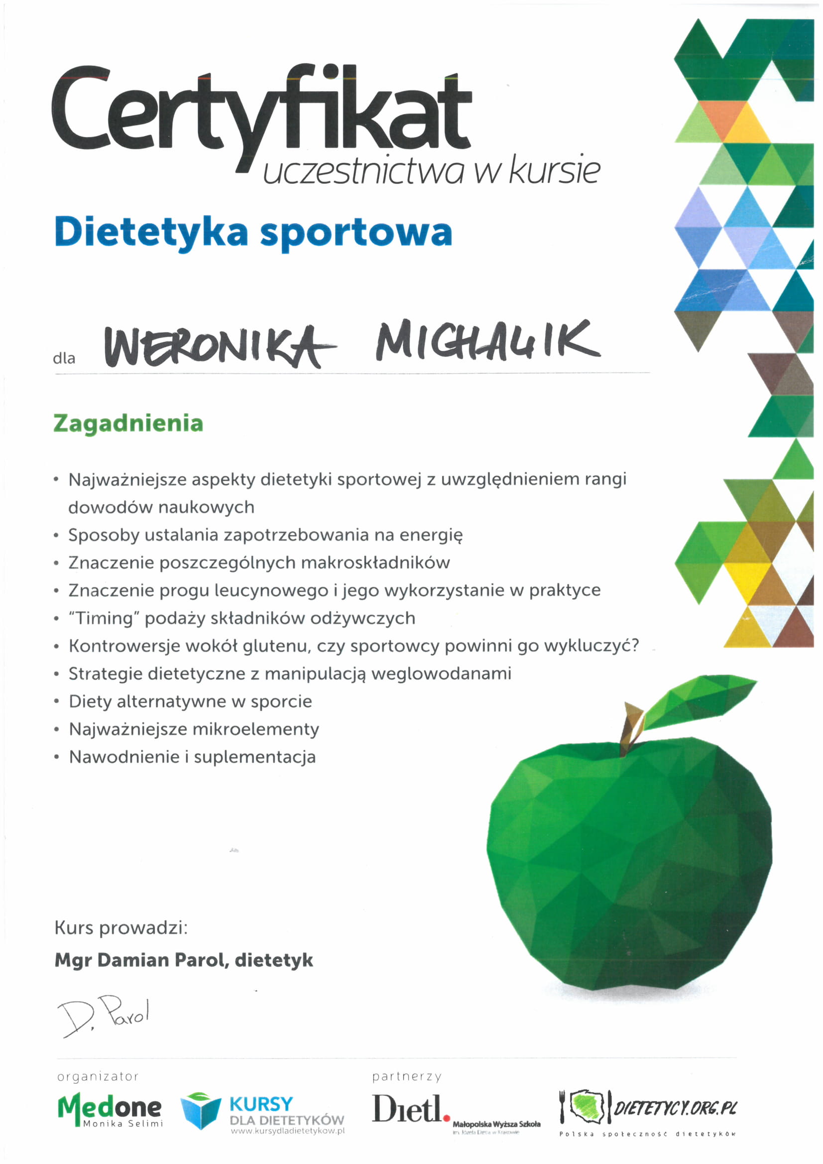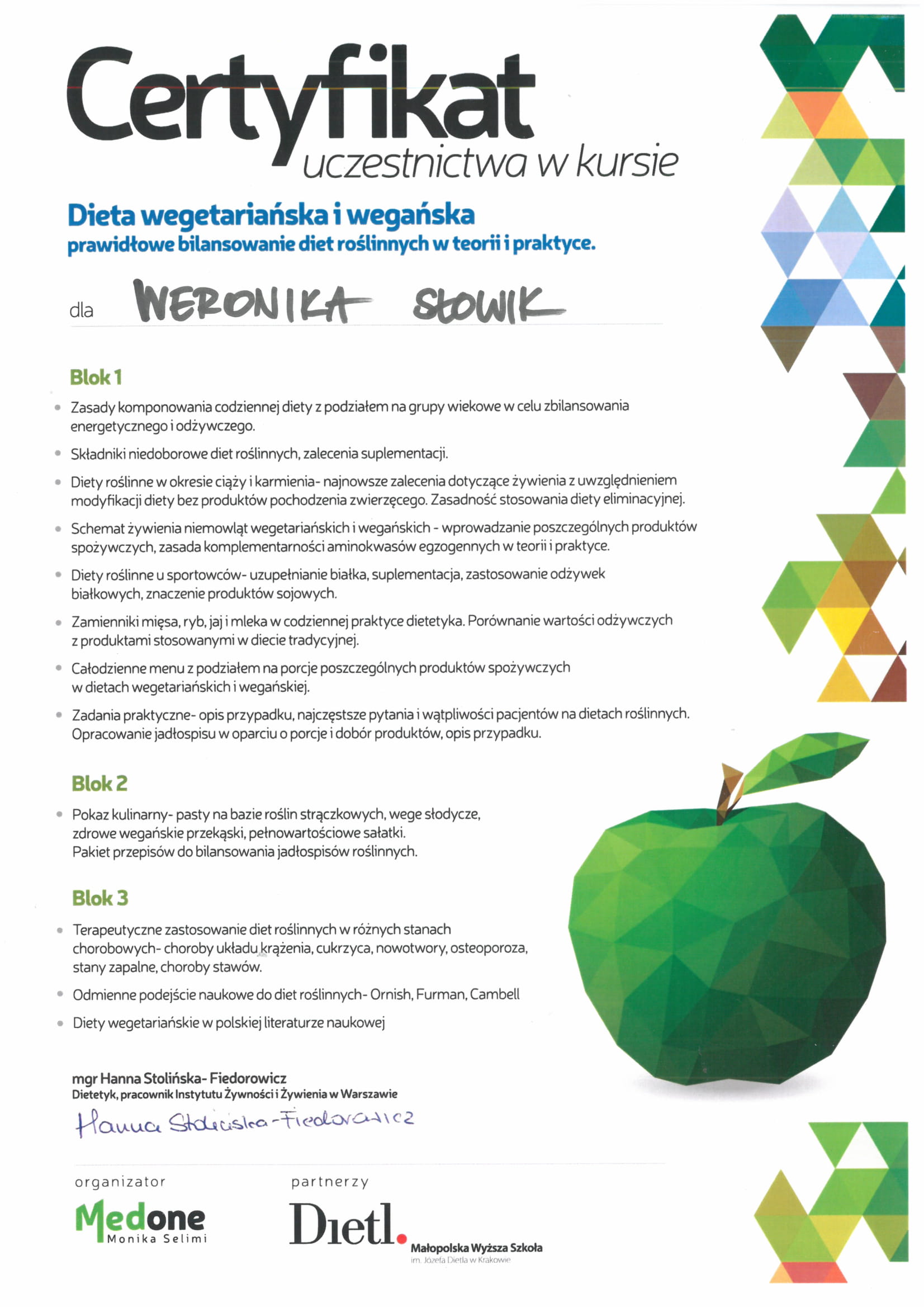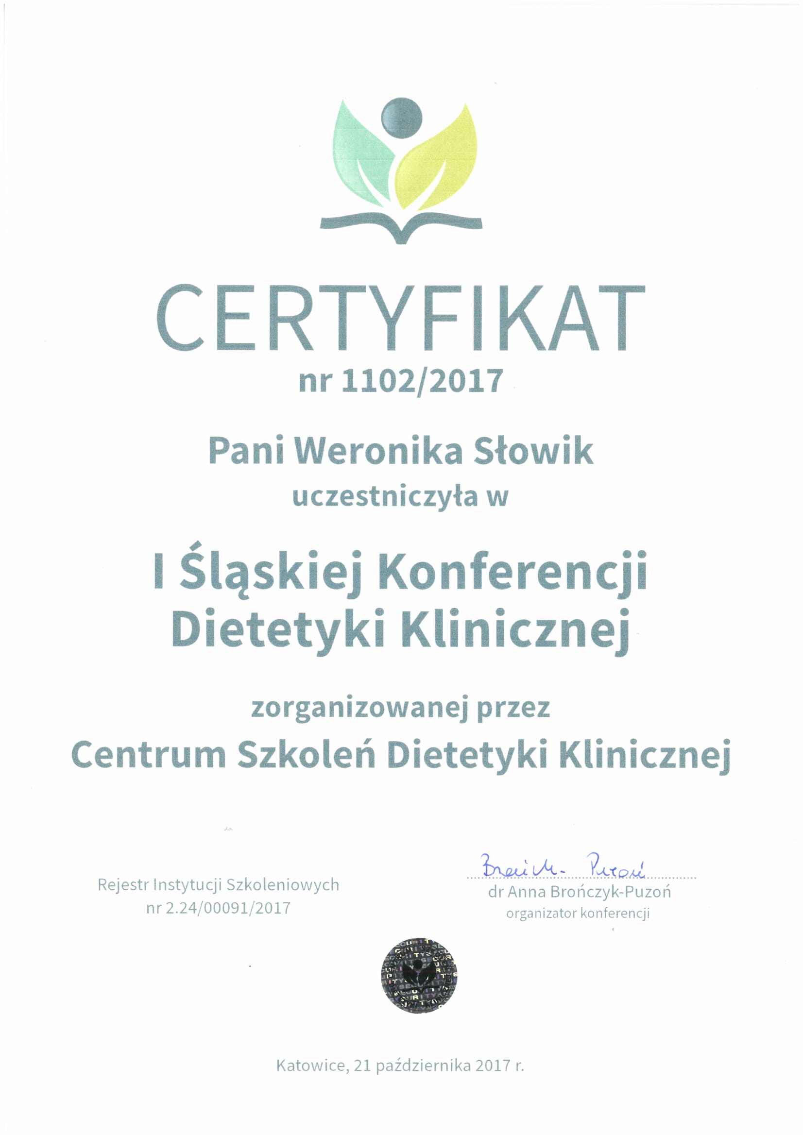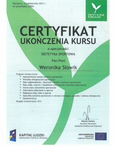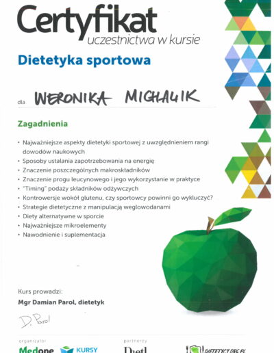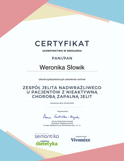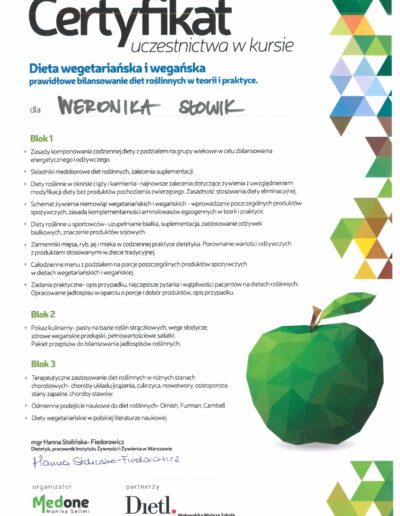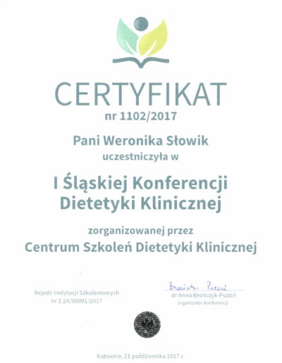 Ukończyłam Śląską Wyższą Szkołę Medyczną w Katowicach na kierunku dietetyka kliniczna oraz psychodietetyka.